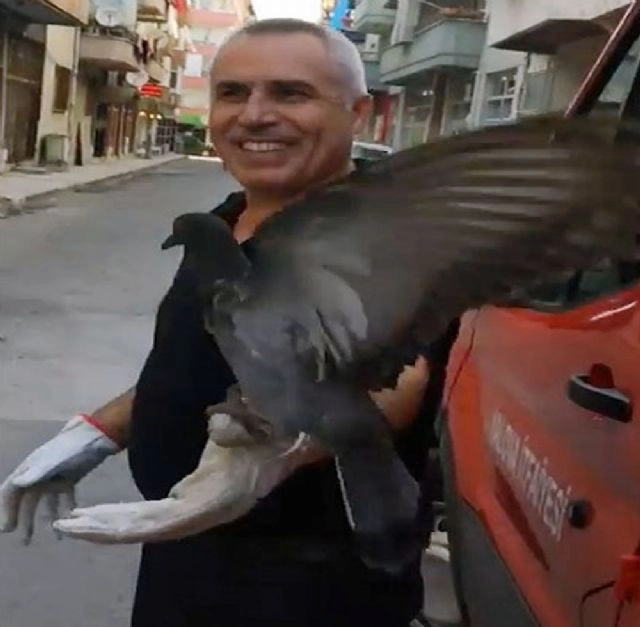Yalova'da ayağına ip dolanarak çatıda mahsur kalan güvercini itfaiye kurtardı. Güvercin, kendisini kurtaran itfaiyeciyi bir türlü bırakmadı.