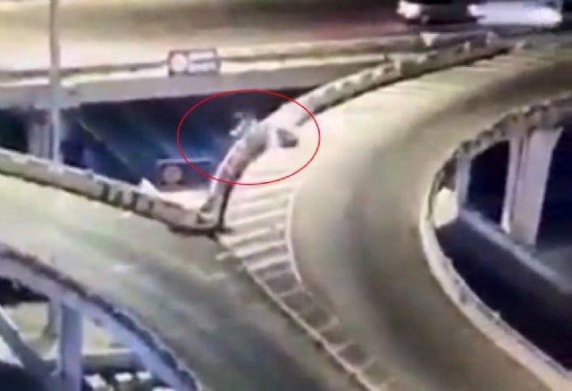 Çin'de viraja hızlı giren motosikletli, bu inanılmaz kazada hayatından oldu.Motosikleti bariyere çarpan şahıs, viyadükten aşağı uçtu. Kazayı fark edenler durumu hemen polis ve sağlık ekiplerine bildirdi. Ama ekipler olay yerine geldiğinde çok geçti, şahıs hayatını kaybetmişti.