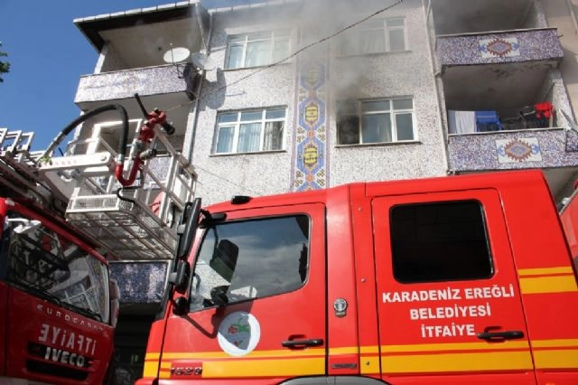 Zonguldak'ın Ereğli ilçesinde bir dairede çıkan yangında evdeki 4 çocuk, komşusunda bulunan anneleri tarafından kurtarıldı. Olay, Bağlık Mahallesi 1. Manolya Sokak'ta meydana geldi. Edinilen bilgiye göre, 4 katlı binanın 3. katında kiracı olarak oturan Ercan Yavuz'a ait evde bilinmeyen bir nedenle yangın çıktı. Bu sırada yan dairedeki komşusunda bulunan anne Ayşe Yavuz, yangını fark ederek 4 çocuğunu yoğun dumana rağmen evden çıkartmayı başardı. Olay yerine itfaiye ekipleri sevk edilirken, yanan dairenin bir alt katında oturan ev sahibi yoğun duman nedeniyle evden çıkamadı. Ev sahibi, itfaiye ekipleri tarafından pencereden merdiven yardımı ile kurtarıldı. Çocuklar annelerine sarılarak ağlarken, itfaiye ekipleri yangını kısa sürede söndürerek soğutma çalışması yaptı.Bina sakinleri tedbir amacıyla tahliye edildi. Olayla ilgili soruşturma başlatıldı. (Vedat Kılıç /İHA)