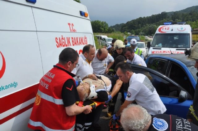 Bursa'nın İnegöl ilçesinde kaza yapan araçtaki yaralılara müdahale ambulansa otomobil çarparken, bir kişi öldü, 3'ü sağlıkçı 8 kişi yaralandı.Eskişehir'den İnegöl'e seyir halinde olan Gökhan Barış (25) idaresindeki 06 KA 6214 plakalı özel otomobil, Yeniköy kavşağında yağış sebebiyle kontrolden çıkarak istinat duvarına çarptı. Kazada yaralı olduğu ihbarını alan 112 Acil Servis ekibi yola çıktı. Ender Cangüloğlu'nun kullandığı 16 YL 409 plakalı 112 ambulansında görevli ATT Ebru Turan ile Şadimen Kaya, yaralılara kaza yerinde müdahale etti. Bölge trafik ekipleri de gelerek tedbir aldı. Kaza yerinde ilk tedavileri yapılan 06 KA 6214 plakalı özel otomobilin sürücüsü Gökhan Barış ile yanında bulunan yaralılar 47 yaşındaki Bediha Barış, 24 yaşındaki Ayşegül Barış ile 52 yaşındaki Seyfi Barış ambulans içine alındı.Ambulans tam hareket etmek üzereyken Eskişehir'den Bursa'ya seyir halinde olan Mehmet Erman Cengin idaresindeki 77 AJ 841 plakalı özel otomobil kontrolden çıkarak, ambulansa arkadan çarptı. Şiddetli çarpmanın etkisi ile ambulansta bulunanlar ve otomobildekiler yaralandı. Hurdaya dönen 77 plakalı özel otomobilin sürücüsü araç içerisinde sıkıştı. Sürücü Mehmet Erman Cengin, kaza yerine sevk edilen itfaiye ekiplerince sıkıştığı yerde çıkarıldı.Yaralanan ambulans sürücüsü Ender Cangüloğlu, ATT'lar Ebru Turan ve Şadimen Kaya, 06 plakalı otomobilin sürücüsü Gökhan Barış ile yanında bulunan yaralılar 47 yaşındaki Bediha Barış, 24 yaşındaki Ayşegül Barış ile 52 yaşındaki Seyfi Barış, 77 plakalı otomobilin sürücüsü Mehmet Erman Cengin ve yanındaki kızı 31 yaşındaki Ergül Mine Cengiz, kaza yerine sevk edilen 112 ambulanslarıyla Devlet Hastanesi'ne sevk edildi. Hastaneye sevk edilen 9 yaralıdan Mehmet Erman Cengin kurtarılamadı. Bölge trafik ekiplerinin de ölümden döndüğü kazayla alakalı tahkikat sürüyor(Salih Bakıcı/İHA)