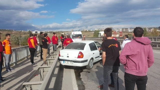 Samsun'da kontrolden çıkan otomobilin bariyere çarptığı kazada yaralanan sürücüye ilk müdahaleyi Trabzonspor maçına giden sarı kırımızılı taraftarlar yaptı.Kaza, Samsun'un Canik ilçesi Çevre Yolu Mert Irmağı köprüsü üzerinde saat 10.30 sıralarında meydana geldi. Edinilen bilgiye göre, Kubilay Zengin (24) idaresindeki 55 DU 639 plakalı otomobil ile seyir halindeyken direksiyon hakimiyetinin kaybedilmesi sonucu yolun sağındaki bariyere çarptı. Kazada araç sürücüsü Kubilay Zengin yaralanırken, yaralı sürücüsü ilk müdahaleyi yolcu otobüsü ile Trabzonspor maçına giden -Galatasaray taraftarlarI yaptı. Taraftarlar otobüsten inerek 112 Acil Servis ekiplerine haber verdi ve ardından da içlerinde bulunan sağlık memuru yaralıya ilk müdahaleyi yaptı. Yaralı Kubilay Zengin, 112 Acil Servis ekipleri tarafından ambulansla özel bir hastaneye kaldırılarak tedavi altına alındı. Kazayla ilgili soruşturma devam ediyor.(Muhammer Ay/İHA)