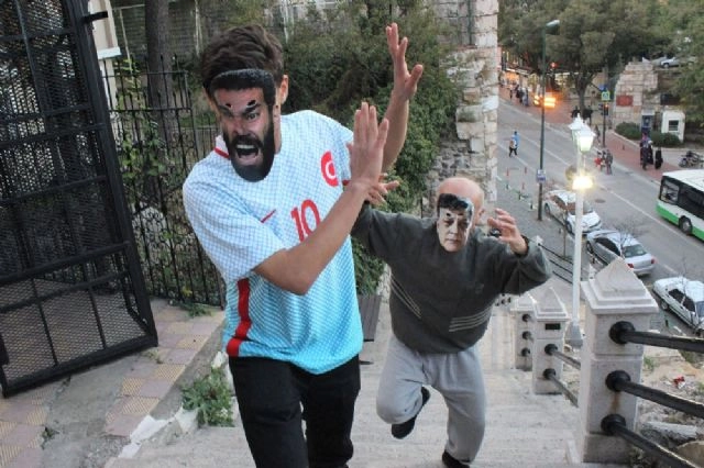 Yılmaz Vural maskesi takan tiyatrocu Bahtiyar Keskin, Arda Turan'ın maskesini takan kişiyi elinde sopayla sokak sokak kovaladı.