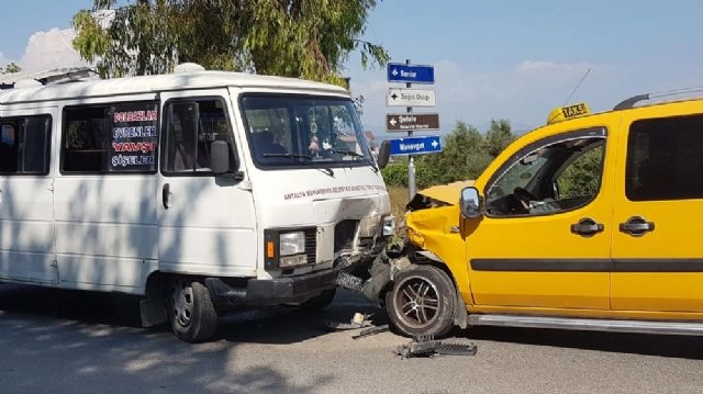 Antalya'nın Manavgat ilçesinde yolcu minibüsü ile ticari taksinin çarpışması sonucu meydana gelen kazada 6 kişi yaralandı.Kaza, öğle saatlerinde Sarılar Mahallesi'nde meydana geldi. Edinilen bilgiye göre, Manavgat istikametinden Sarılar istikametine giden Mehmet Kaya'nın kullandığı 07 J 0614 plakalı ticari taksi ile karşı yönden gelen olan İsmet Doğan'ın kullandığı 07 LC 295 plakalı yolcu minibüsü çarpıştı. Kazada araç sürücüleri Mehmet Kaya ve İsmet Doğan'ın yanı sıra minibüste yolcu olarak bulunan Tevhide Gülerer, Mehmet han Özen ve İsa Özen ile takside yolcu olarak Cihan Bakır yaralandı. Manavgat Devlet Hastanesine kaldırılan yaralıların hayati tehlikelerinin bulunmadığı bildirildi.(Arif Kaplan /İHA)