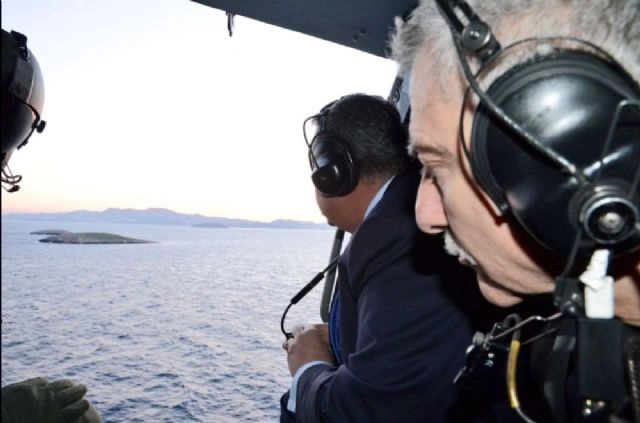 Yunanistan Savunma Bakanı Panos Kamenos, 3 subaylarının ölüm yıl dönümü dolayısıyla Kardak Kayalıklarının deniz bölgesine havadan çelenk attı.
