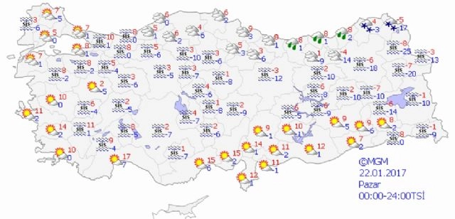 Rize çevreleri ve Artvin'in kıyı kesimlerinin yağmurlu, Artvin'in iç kesimlerinin karla karışık yağmur ve yer yer kar yağışlı geçeceği tahmin ediliyor. İç ve doğu kesimlerde buzlanma ve don olayı ile birlikte sabah ve gece saatlerinde yer yer sis ve pus hadisesi görüleceği tahmin ediliyor.Meteoroloji Genel Müdürlüğünden alınan tahminlere göre, hava sıcaklığı ülke genelinde mevsim normalleri civarında seyredecek. Rüzgar, genellikle kuzey yönlerden hafif, ara sıra orta kuvvette esecek. Bazı illerde beklenen hava durumuyla günün en yüksek sıcaklıkları ise şöyle:Ankara: Parçalı ve az bulutlu 3İstanbul: Parçalı ve az bulutlu 7İzmir: Parçalı ve az bulutlu 11Adana: Parçalı ve az bulutlu 15Antalya: Parçalı ve az bulutlu 17Samsun: Parçalı ve çok bulutlu 9Trabzon: Çok bulutlu 8Erzurum: Parçalı ve az bulutlu -6Diyarbakır: Parçalı ve az bulutlu 9
