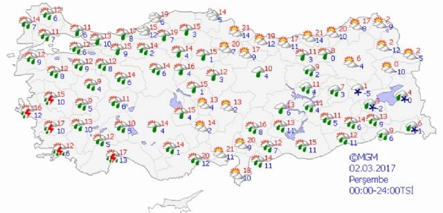 Yapılan son değerlendirmelere göre, yurtta hava durumu bugün şöyle. Ülke genelinin parçalı, yer yer çok bulutlu, Marmara, Ege, Akdeniz, İç Anadolu'nun batısı, Batı Karadeniz'in iç kesimleri, Doğu Anadolu'nun güney ve batısı, Güneydoğu Anadolu ile Yozgat, Kırşehir, Aksaray, Sivas, Amasya, Samsun, Sinop, Gümüşhane, Bayburt, Bingöl ve Muş çevrelerinin yağışlı geçeceği tahmin ediliyor. Yağışların genellikle yağmur ve sağanak, Kıyı Ege, Akdeniz kıyıları ile Çanakkale ve Balıkesir çevrelerinde gök gürültülü sağanak, Tunceli, Bingöl, Muş, Bitlis ve Hakkari çevrelerinde karla karışık yağmur, Batı Akdeniz'in iç kesimlerinin yükseklerinde yer yer kar şeklinde olması bekleniyor. Yağışların Muğla, Aydın kıyıları, Antalya, Isparta'nın güney ve batısı, Burdur'un doğu kesimleri ile zamanla Mersin çevrelerinde kuvvetli ve yer yer çok kuvvetli olması bekleniyor. Bu sabah ve gece saatlerinde İç Anadolu'nun kuzeydoğusu, Doğu Karadeniz'in iç kesimleri ve Doğu Anadolu'da buzlanma ve don olayı ile birlikte doğu kesimlerde yer yer sis ve pus hadisesi bekleniyor. Meteoroloji Genel Müdürlüğünden alınan tahminlere göre, hava sıcaklığı güney ve batı kesimlerde 4 ila 6 derece azalacak, diğer yerlerde önemli bir değişiklik olmayacak. Rüzgar, genellikle güneyli, Marmara ile Kıyı Ege'de kuzeyli yönlerden hafif, ara sıra orta kuvvette, öğle saatlerinden sonra Batı Akdeniz'de kuvvetlice (40-60 Km/saat) esecek. Bazı illerde beklenen hava durumuyla günün en yüksek sıcaklıkları ise şöyle:Ankara: Parçalı çok bulutlu, zamanla aralıklı sağanak yağışlı 14İstanbul: Az bulutlu, zamanla parçalı ve çok bulutlu, yağmur ve sağanak yağışlı 11İzmir: Parçalı çok bulutlu, aralıklı sağanak ve gök gürültülü sağanak yağışlı 16Adana: Parçalı ve çok bulutlu, zamanla sağanak yağışlı 21Antalya: Parçalı ve çok bulutlu, zamanla aralıklı sağanak ve gök gürültülü sağanak yağışlı (Yağışların yerel olarak kuvvetli ve çok kuvvetli olması bekleniyor) 17Samsun: Az bulutlu, zamanla parçalı ve çok bulutlu, gece saatlerinden itibaren sağanak yağışlı 24Trabzon: Parçalı bulutlu 21Erzurum: Parçalı ve çok bulutlu 6Diyarbakır: Parçalı çok bulutlu, zamanla aralıklı yağmurlu 11