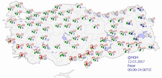 Yapılan son değerlendirmelere göre, ülke genelinde yağış bekleniyor. Genellikle yağmur ve sağanak, Doğu Anadolu'nun doğusu ve Doğu Karadeniz'in iç kesimlerinde karla karışık yağmur ve kar şeklinde olması beklenen yağışların Akdeniz Bölgesi, Karaman, Aksaray, Niğde, Adıyaman, Elazığ, Tunceli ve Bingöl çevreleri ile Konya'nın güney kesimlerinde kuvvetli (21-50 mm), Mersin ve Adana çevreleri ile Kahramanmaraş'ın batı çevrelerinde çok kuvvetli ve şiddetli (51-100 mm) olacağı tahmin ediliyor. Sabah ve gece saatlerinde Doğu Anadolu'nun kuzey ve doğusunda buzlanma ve don olayı bekleniyor. Meteoroloji Genel Müdürlüğünden alınan tahminlere göre, hava sıcaklığı batı ve iç kesimlerde 2 ila 6 derece azalacak, diğer yerlerde önemli bir değişiklik olmayacak. Rüzgar, genellikle güney ve güneydoğu, Marmara ve Ege'de kuzey yönlerden hafif, ara sıra orta kuvvette, Kıyı Ege ve Akdeniz'de kuvvetli (30-60 km/sa) olarak esecek. Bazı illerde beklenen hava durumuyla günün en yüksek sıcaklıkları ise şöyle:Ankara: Parçalı ve çok bulutlu, aralıklı yağmurlu 11İstanbul: Çok bulutlu, aralıklı yağmurlu 11İzmir: Çok bulutlu, akşam saatlerine kadar aralıklı sağanak ve gök gürültülü sağanak yağışlı 16Adana: Çok bulutlu, aralıklı sağanak ve gök gürültülü sağanak yağışlı (Yağışların yerel olarak kuvvetli, yer yer çok kuvvetli ve şiddetli olması bekleniyor) 16Antalya: Çok bulutlu, aralıklı sağanak ve gök gürültülü sağanak yağışlı (Yağışların yerel olarak kuvvetli olması bekleniyor) 13Samsun: Parçalı ve çok bulutlu, gece saatlerinde hafif yağmurlu 17Trabzon: Parçalı ve çok bulutlu, gece saatlerinde yağmurlu 16Erzurum: Çok bulutlu, aralıklı karla karışık yağmur ve kar yağışlı 5Diyarbakır: Parçalı ve çok bulutlu, aralıklı yağmur ve sağanak yağışlı 18
