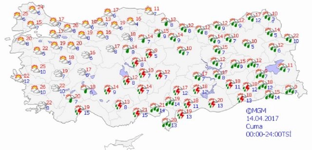 Yapılan son değerlendirmelere göre, yurtta hava durumu bugün şöyle.Akdeniz, İç Anadolu'nun güneyi ve doğusu, Orta ve Doğu Karadeniz, Doğu ve Güneydoğu Anadolu'nun sağanak, yer yer gök gürültülü sağanak yağışlı, diğer yerlerin parçalı ve az bulutlu geçeceği tahmin ediliyor. Yağışların Giresun ve Trabzon çevrelerinde kuvvetli (21-50 mm), Antalya'nın doğu kesimleri, Mersin, Adana, Osmaniye, Hatay, Kahramanmaraş, Tunceli, Bingöl, Muş, Bitlis, Şırnak, Hakkari, Van, Diyarbakır, Siirt ve Batman çevrelerinde kuvvetli yer yer çok kuvvetli (21-75 mm) olması bekleniyor. Sabah saatlerinde Marmara'nın doğusu, İç Ege, İç Anadolu'nun kuzeybatısı ve Batı Karadeniz'de yer yer pus ve sis hadisesi meydana geleceği tahmin ediliyor. Meteoroloji Genel Müdürlüğünden alınan tahminlere göre, hava sıcaklığının yurt genelinde mevsim normalleri civarında seyredeceği ve önemli bir değişiklik olmayacağı tahmin ediliyor.Rüzgarın ise genellikle kuzey ve doğu, yurdun doğu kesimlerinde güney ve güneybatı yönlerden hafif, ara sıra orta kuvvette, İskenderun Körfezi ve Hatay kıyılarında kuvvetlice (30-50 Km/saat), Doğu Anadolu'nun batısında ve güneyinde, Güneydoğu Anadolu'nun doğusunda kuvvetli (40-60 Km/sa) esmesi bekleniyor.Bazı illerde beklenen hava durumuyla günün en yüksek sıcaklıkları ise şöyle:Ankara: Parçalı bulutlu 17İstanbul: Parçalı bulutlu 17İzmir: Parçalı ve az bulutlu 22Adana: Parçalı ve çok bulutlu, aralıklı sağanak ve gök gürültülü sağanak yağışlı geçeceği tahmin ediliyor. Yağışların kuvvetli ve yer yer çok kuvvetli olması bekleniyor. 21Antalya: Parçalı ve çok bulutlu, aralıklı sağanak ve gök gürültülü sağanak yağışlı geçeceği tahmin ediliyor. Yağışların doğu kesimlerinde kuvvetli ve yer yer çok kuvvetli olması bekleniyor. 19Samsun: Parçalı ve çok bulutlu, bugün sabah saatlerinde hafif sağanak yağışlı 12Trabzon: Parçalı yer yer çok bulutlu, sağanak yağışlı geçeceği tahmin ediliyor. Yağışların ; bugün sabah saatlerinde yer yer kuvvetli olması bekleniyor. 12Erzurum: Parçalı ve çok bulutlu, aralıklı yağmurlu 10Diyarbakır: Parçalı ve çok bulutlu, aralıklı sağanak ve gök gürültülü sağanak yağışlı geçeceği tahmin ediliyor. Yağışların, kuvvetli ve yer yer çok kuvvetli olması bekleniyor. 18