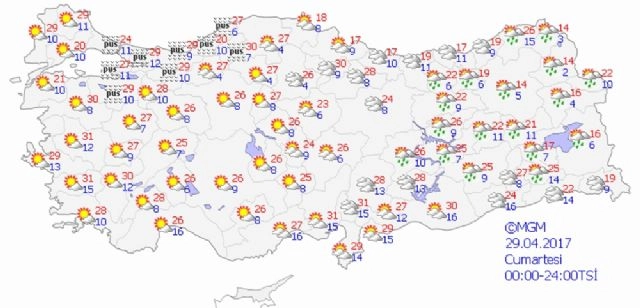 Yapılan son değerlendirmelere göre, yurtta hava durumu bugün şöyle.Ülkenin doğu kesimlerinin parçalı ve çok bulutlu, sabah saatlerinde Doğu Anadolu'nun kuzeydoğusu ile öğle saatlerinden sonra Doğu Karadeniz'in iç kesimleri, Hakkari ve Şırnak dışında Doğu Anadolu bölge geneli, Diyarbakır ve Siirt çevrelerinin kısa süreli ve yerel olmak üzere sağanak ve yer yer gök gürültülü sağanak yağışlı geçeceği tahmin ediliyor. Bu sabah saatlerinde Marmara'nın kuzey kesimleri ile Batı Karadeniz kıyılarında yer yer pus ve sis olayı bekleniyor. Meteoroloji Genel Müdürlüğünden alınan tahminlere göre, hava sıcaklığının güney, iç ve batı kesimlerde artarak mevsim normalleri üzerinde seyredeceği tahmin ediliyor. Rüzgarın genellikle güney ve batı, Karadeniz ile güneydoğu kesimlerde kuzey ve doğu yönlerden hafif, ara sıra orta kuvvette esmesi bekleniyor.Bazı illerde beklenen hava durumuyla günün en yüksek sıcaklıkları ise şöyle:Ankara: Az bulutlu ve açık 26İstanbul: Az bulutlu ve açık, sabah saatlerinde Karadeniz'e bakan kuzey kesimlerinde yer yer pus ve sisli 24Bursa: Az bulutlu ve açık 29İzmir: Az bulutlu ve açık 29Adana: Az bulutlu ve açık, öğle saatlerinden sonra parçalı ve çok bulutlu 31Antalya: Az bulutlu ve açık 26Samsun: Az bulutlu 17Trabzon: Az bulutlu ve açık, öğle saatlerinden sonra parçalı yer yer çok bulutlu 17Erzurum: Parçalı ve çok bulutlu, yerel olmak üzere aralıklı sağanak ve yer yer gök gürültülü sağanak yağışlı 14Diyarbakır: Parçalı zamanla çok bulutlu, öğle saatlerinden sonra yerel olmak üzere sağanak ve yer yer gök gürültülü sağanak yağışlı 25