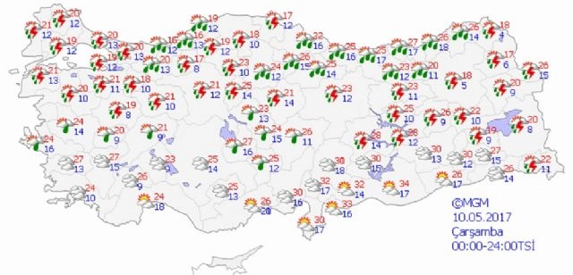 Yapılan son değerlendirmelere göre, yurtta hava durumu bugün şöyle.Yurt genelinin parçalı ve çok bulutlu, Marmara, Kuzey Ege, İç Anadolu'nun kuzeyi, Karadeniz, Doğu Anadolu ile Niğde, Kayseri ve Nevşehir çevrelerinin sağanak ve yer yer gök gürültülü sağanak yağışlı geçeceği tahmin ediliyor. Yağışların Orta ve Doğu Karadeniz ile Bartın çevrelerinde yerel olarak kuvvetli olması bekleniyor. Meteoroloji Genel Müdürlüğünden alınan tahminlere göre, hava sıcaklığının kuzeybatı kesimlerde 2 ila 5 derece azalacağı, iç ve doğu bölgelerde 2 ila 4 derece artacağı tahmin ediliyor. Rüzgar, genellikle güney ve güneybatı, Batı Karadeniz, İç Anadolu'nun batısı ile Kuzey Ege'de kuzey ve kuzeybatı yönlerden hafif, ara sıra orta kuvvette, Doğu Akdeniz'in iç kesimleri, İç Anadolu'nun güney ve doğusu, Orta ve Doğu Karadeniz'in iç kesimleri ile Doğu Anadolu'da kuvvetli ve yer yer kısa süreli fırtına (50-80 yer yer 100 Km/sa) şeklinde esmesi bekleniyor. Bazı illerde beklenen hava durumuyla günün en yüksek sıcaklıkları ise şöyle: Ankara: Parçalı ve çok bulutlu, aralıklı sağanak ve gök gürültülü sağanak yağışlı 21İstanbul: Parçalı ve çok bulutlu, aralıklı sağanak ve gök gürültülü sağanak yağışlı 20İzmir: Parçalı ve çok bulutlu, öğle saatlerinde hafif sağanak yağışlı 24Bursa: Parçalı ve çok bulutlu, aralıklı sağanak ve gök gürültülü sağanak yağışlı 21Adana: Parçalı ve az bulutlu 30Antalya: Parçalı ve az bulutlu 24Samsun: Parçalı ve çok bulutlu, sağanak ve gök gürültülü sağanak yağışlı (Yağışların öğle saatlerinden sonra yerel olarak kuvvetli olması bekleniyor) 20Trabzon: Parçalı ve çok bulutlu, öğle saatlerinden itibaren sağanak ve gök gürültülü sağanak yağışlı (Yağışların akşam saatlerinden sonra yerel olarak kuvvetli olması bekleniyor) 27Erzurum: Parçalı ve çok bulutlu, aralıklı sağanak ve yer yer gök gürültülü sağanak yağışlı 18Diyarbakır: Parçalı ve az bulutlu 30
