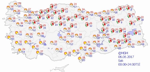 İç Anadolu'nun kuzeybatısı, Batı Karadeniz, Orta ve Doğu Karadeniz'in iç kesimleri, Doğu Anadolu'nun kuzeyi ile Sakarya, Bilecik, Sivas, Kırşehir, Elazığ, Bingöl, Muş, Bitlis, Van, Diyarbakır, Batman ve Siirt çevrelerinin yerel olmak üzere sağanak ve gök gürültülü sağanak yağışlı geçeceği tahmin ediliyor. Meteoroloji Genel Müdürlüğünden alınan tahminlere göre, hava sıcaklığının batı kesimlerde 2 ila 4 derece artacağı, diğer yerlerde 1 ila 3 derece azalacağı tahmin ediliyor. Rüzgarın ise ülkemizin batı kesimlerinde kuzey ve kuzeydoğu, zamanla batı ve kuzeybatı, diğer yerlerde batı ve güneybatı yönlerden hafif, ara sıra orta kuvvette, Doğu Anadolu'nun batısında kuvvetli (30-60 km/sa) olarak esmesi bekleniyor. Bazı illerde beklenen hava durumuyla günün en yüksek sıcaklıkları ise şöyle:Ankara: Parçalı bulutlu sabah saatlerinde hafif sağanak, öğle saatlerinden sonra il geneli kısa süreli ve yerel olmak üzere sağanak ve gök gürültülü sağanak yağışlı 26İstanbul: Parçalı bulutlu 27İzmir: Az bulutlu ve açık 31Adana: Az bulutlu ve açık 31Antalya: Az bulutlu ve açık 27Samsun: Parçalı bulutlu 24Trabzon: Parçalı bulutlu 23Erzurum: Az bulutlu ve açık zamanla parçalı bulutlu, aralıklı sağanak ve yer yer gök gürültülü sağanak yağışlı 25Diyarbakır: Az bulutlu ve açık öğle saatlerinden itibaren parçalı çok bulutlu, sağanak ve gök gürültülü sağanak yağışlı 36