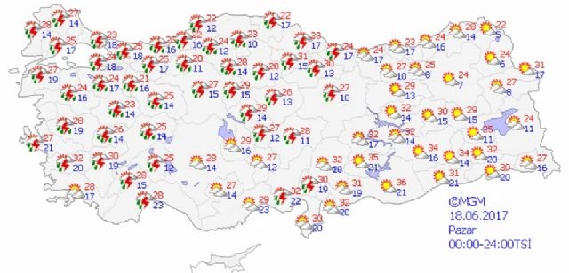 Yapılan son değerlendirmelere göre, yurtta bugün hava durumu şöyle. Ülke genelinin parçalı ve yer yer çok bulutlu, Marmara, Ege, Batı Akdeniz, Doğu Akdeniz'in iç kesimleri, İç Anadolu, Batı ve Orta Karadeniz, Doğu Anadolu'nun kuzeydoğusu ile Giresun, Gümüşhane, Bitlis, Van ve Muş çevrelerinin aralıklı sağanak ve yer yer gök gürültülü sağanak yağışlı geçeceği tahmin ediliyor. Yağışların Balıkesir, Bursa, Bilecik, Sakarya, Manisa, Uşak, Kütahya, Afyon, Isparta, Burdur, Konya'nın kuzey kesimleri, Eskişehir, Ankara'nın kuzey ve batısı , Bolu, Karabük, Kastamonu, Zonguldak, Bartın, Sinop, Samsun ve Çorum çevrelerinde yerel olarak kuvvetli olması bekleniyor. Meteoroloji Genel Müdürlüğünden alınan tahminlere göre, hava sıcaklığı kuzeybatı kesimlerde 4 ila 6 derece azalacak, doğu kesimlerde 2 ila 4 derece artacak, diğer yerlerde önemli bir değişiklik olmayacak. Rüzgar, kuzey kesimlerde kuzey ve kuzeybatı, diğer yerlerde batı ve güneybatı yönlerden hafif, arasıra orta kuvvette, yağış anında yer yer kuvvetli olarak esecek. Bazı illerde beklenen hava durumuyla günün en yüksek sıcaklıkları ise şöyle:Ankara: Parçalı çok bulutlu, aralıklı sağanak ve gök gürültülü sağanak yağışlı (Yağışların öğle saatlerinden sonra kuzey ve batı çevrelerinde yerel olarak kuvvetli olması bekleniyor) 27İstanbul: Parçalı ve çok bulutlu, öğle saatlerinden itibaren sağanak ve yer yer gök gürültülü sağanak yağışlı 23İzmir: Parçalı ve çok bulutlu, aralıklı sağanak ve gök gürültülü sağanak yağışlı 27Adana: Parçalı çok bulutlu, öğle saatlerinden itibaren aralıklı sağanak ve gök gürültülü sağanak yağışlı 32Antalya: Az bulutlu, zamanla parçalı ve çok bulutlu, öğle saatlerinden sonra sağanak ve gök gürültülü sağanak yağışlı 28Samsun: Parçalı ve yer yer çok bulutlu, öğle saatlerinden itibaren aralıklı sağanak ve yer yer gök gürültülü sağanak yağışlı (Yağışların gece saatlerinde yerel olarak kuvvetli olması bekleniyor) 23Trabzon: Az bulutlu, zamanla parçalı ve çok bulutlu, iç kesimleri yerel olarak sağanak yağışlı 23Erzurum: Az bulutlu ve açık, zamanla parçalı bulutlu 24Diyarbakır: Az bulutlu ve açık, zamanla parçalı bulutlu 34
