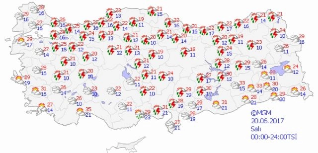 Yapılan son değerlendirmelere göre,yurtta bugün hava durumu şöyle.Ülke genelinin parçalı ve yer yer çok bulutlu, Marmara'nın doğusu, İç Ege, İç Anadolu'nun kuzey ve doğusu, Karadeniz, Doğu Anadolu'nun batısı ile İstanbul, Aksaray, Adana, Osmaniye, Kahramanmaraş, Ardahan ve Erzurum çevrelerinin aralıklı sağanak ve yer yer gök gürültülü sağanak yağışlı geçeceği tahmin ediliyor. Yağışların, Orta ve Doğu Karadeniz kıyıları ile Kastamonu ve Sinop çevrelerinde yerel olarak kuvvetli olması bekleniyor. Meteoroloji Genel Müdürlüğünden alınan tahminlere göre, hava sıcaklığının batı kesimlerde 2 ila 4 derece artacağı, diğer yerlerde önemli bir değişiklik olmayacağı tahmin ediliyor. Rüzgarın, genellikle kuzeyli yönlerden, güneydoğu kesimlerde güneybatı yönlerden hafif, ara sıra orta kuvvette eseceği tahmin ediliyor. Bazı illerde beklenen hava durumuyla günün en yüksek sıcaklıkları ise şöyle:Ankara:Parçalı çok bulutlu, ilk saatlerde aralıklı sağanak ve gök gürültülü sağanak yağışlı 21İstanbul:Parçalı, yer yer çok bulutlu, bu sabah ilk saatler ile öğle saatlerinde aralıklı sağanak ve gök gürültülü sağanak yağışlı 26İzmir: Parçalı yer yer çok bulutlu 29Adana:Parçalı ve çok bulutlu, sabah ilk saatler ile öğle saatlerinde aralıklı sağanak ve gök gürültülü sağanak yağışlı 31Antalya:Parçalı ve çok bulutlu 35Samsun:Parçalı ve çok bulutlu, aralıklı sağanak ve gök gürültülü sağanak yağışlı geçeceği tahmin ediliyor. Yağışlar sabah ilk saatlerde yerel olarak kuvvetli 22Trabzon:Parçalı ve çok bulutlu, aralıklı sağanak ve gök gürültülü sağanak yağışlı geçeceği tahmin ediliyor. Yağışlar öğle saatlerinde yerel olarak kuvvetli 22Erzurum:Parçalı ve çok bulutlu, bu sabah ve öğle saatlerinde aralıklı sağanak ve gök gürültülü sağanak yağışlı 23Diyarbakır:Parçalı ve çok bulutlu 33