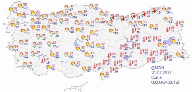 Yapılan son değerlendirmelere göre, yurtta hava durumu bugün şöyle.Yurdun kuzey ve batı kesimlerinin parçalı bulutlu, İç Ege, Göller yöresi,1 Orta ve Doğu Karadeniz kıyıları ile Eskişehir, Bolu ve Artvin çevrelerinin sağanak ve yer yer gök gürültülü sağanak yağışlı, diğer yerlerin az bulutlu ve açık geçeceği tahmin ediliyor. Meteoroloji Genel Müdürlüğünden alınan tahminlere göre, hava sıcaklığının kuzey ve iç kesimlerde 2 ila 4 derece artacağı, diğer yerlerde önemli bir değişiklik olmayacağı ve ülkemiz genelinde mevsim normalleri civarında seyredeceği tahmin ediliyor.Rüzgarın ise genellikle kuzey yönlerden, güneydoğu kesimler ile Akdeniz'in kıyılarında batı ve güneybatı yönlerden hafif, ara sıra orta kuvvette, Marmara'nın güneybatısı ile Ege kıyılarında kuzeyli yönlerden kuvvetlice (30-50 km/sa) eseceği tahmin ediliyor.Bazı illerde beklenen hava durumuyla günün en yüksek sıcaklıkları ise şöyle:Ankara: Parçalı ve az bulutlu 32İstanbul: Parçalı ve az bulutlu 30İzmir: Az bulutlu ve açık 34Adana: Az bulutlu ve açık 36Bursa: Parçalı ve az bulutlu 32Antalya: Parçalı az bulutlu, öğle saatlerinden sonra iç kesimleri kısa süreli ve yerel olmak üzere sağanak ve gök gürültülü sağanak yağışlı 33Samsun: Parçalı bulutlu, doğu ilçeleri sağanak ve gök gürültülü sağanak yağışlı 28Trabzon: Parçalı ve çok bulutlu, aralıklı sağanak yağışlı 27Erzurum: Parçalı ve az bulutlu 32Diyarbakır: Az bulutlu ve açık