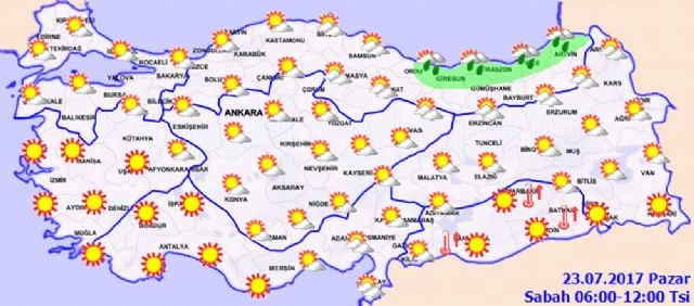 Yapılan son değerlendirmelere göre, ülkenin kuzeydoğu kesimleri ile zamanla Batı Akdeniz'in iç kesimleri ve Doğu Akdeniz'in parçalı yer yer çok bulutlu, Orta ve Doğu Karadeniz kıyıları ile Artvin, Erzurum, Kars ve Ardahan çevrelerinin kısa süreli ve yerel olmak üzere sağanak ve yer yer gök gürültülü sağanak yağışlı, diğer yerlerin az bulutlu ve açık geçeceği tahmin ediliyor. Meteoroloji Genel Müdürlüğünden alınan tahminlere göre, ülke genelinde mevsim normalleri civarında seyreden hava sıcaklıklarının, yağışla birlikte kuzeydoğu kesimlerde 2 ila 4 derece azalacağı, diğer yerlerde önemli bir değişiklik olmayacağı tahmin ediliyor. Rüzgarın genellikle kuzey yönlerden, Akdeniz kıyıları ile güneydoğu kesimlerde batı ve güneybatı yönlerden hafif, ara sıra orta kuvvette, öğle saatlerinde Doğu Anadolu'nun güneydoğusunda güneybatı yönlerden yer yer kuvvetli olarak (30-60 km/sa) esmesi bekleniyor. Bazı illerde beklenen hava durumuyla günün en yüksek sıcaklıkları ise şöyle:Ankara: Az bulutlu ve açık, zamanla parçalı bulutlu 32İstanbul: Az bulutlu ve açık 32İzmir: Az bulutlu ve açık 35Adana: Parçalı ve az bulutlu 36Antalya: Az bulutlu ve açık, zamanla iç kesimleri parçalı bulutlu 33Samsun: Parçalı bulutlu, öğle saatlerinden sonra sağanak ve yer yer gök gürültülü sağanak yağışlı 28Trabzon: Parçalı çok bulutlu, aralıklı sağanak ve yer yer gök gürültülü yağışlı 26Erzurum: Az bulutlu, zamanla parçalı yer yer çok bulutlu, öğle saatlerinde kısa süreli ve yerel olmak üzere sağanak ve gök gürültülü sağanak yağışlı 28Diyarbakır: Az bulutlu ve açık 41