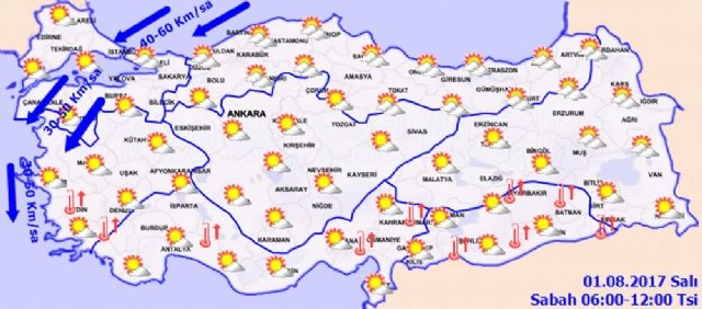 Yapılan son değerlendirmelere göre, yurdun kuzeydoğu kesimlerinin parçalı bulutlu, Doğu Anadolu'nun kuzeydoğusunun yerel olmak üzere sağanak ve gök gürültülü sağanak yağışlı, diğer yerlerin az bulutlu ve açık geçeceği tahmin ediliyor. Meteoroloji Genel Müdürlüğünden alınan tahminlere göre, hava sıcaklığının ülke genelinde 2 ila 4 derece artarak, iç ve doğu kesimlerde mevsim normallerinin üzerinde, batı bölgelerde mevsim normalleri civarında seyredeceği tahmin ediliyor. Rüzgarın genellikle kuzey ve kuzeydoğu, Akdeniz kıyıları ile Güneydoğu Anadolu'da batı ve güneybatı yönlerden hafif, ara sıra orta kuvvette, Marmara, Kuzey ve Kıyı Ege ve Batı Karadeniz kıyılarında kuzey yönlerden kuvvetli (30-60 km/sa) olarak esmesi bekleniyor. Bazı illerde beklenen hava durumuyla günün en yüksek sıcaklıkları ise şöyle:Ankara: Az bulutlu ve açık 33İstanbul: Az bulutlu ve açık 31İzmir: Az bulutlu ve açık 37Adana: Az bulutlu ve açık 36Antalya: Az bulutlu ve açık 37Samsun: Az bulutlu ve açık 28Trabzon: Parçalı bulutlu 27Erzurum: Parçalı bulutlu, öğle saatlerinden sonra sağanak ve gök gürültülü sağanak yağışlı 35Diyarbakır: Az bulutlu ve açık 44