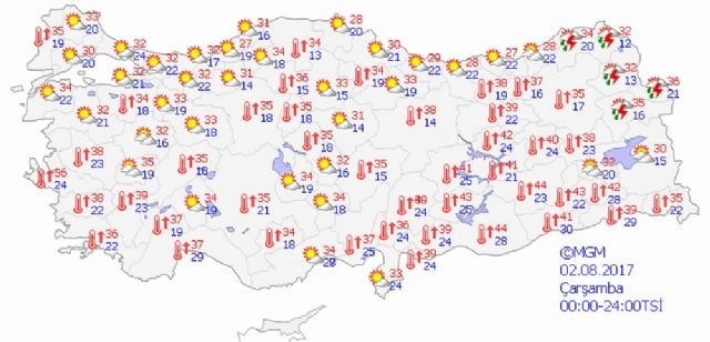 Yapılan son değerlendirmelere göre yurtta bugün hava durumu şöyle.Ülkenin kuzeydoğu kesimleri ile zamanla iç kesimlerinin parçalı ve yer yer çok bulutlu, öğle saatlerinden sonra Rize'nin iç kesimleri, Artvin, Ardahan, Kars, Ağrı, Iğdır çevreleri ile Erzurum'un kuzeydoğu ilçeleri ve Van'ın doğu kesimlerinin yerel olmak üzere sağanak ve gök gürültülü sağanak yağışlı, diğer yerlerin az bulutlu ve açık geçeceği tahmin ediliyor. Meteoroloji Genel Müdürlüğünden alınan tahminlere göre, hava sıcaklığı iç ve batı kesimlerde 2 ila 4 derece azalacak, diğer yerlerde önemli bir değişiklik olmayacak. Rüzgar, genellikle kuzey ve kuzeydoğu, Akdeniz kıyıları ile Güneydoğu Anadolu'da batı ve güneybatı yönlerden hafif, ara sıra orta kuvvette, Marmara ile Kuzey Ege kıyılarında kuvvetli (30-50 km/sa) olarak esecek. Bazı illerde beklenen hava durumuyla günün en yüksek sıcaklıkları ise şöyle:Ankara: Parçalı ve az bulutlu 35İstanbul: Parçalı ve az bulutlu 32İzmir: Az bulutlu ve açık, zamanla parçalı bulutlu 36Adana: Parçalı ve az bulutlu 37Antalya: Az bulutlu, öğle saatlerinden itibaren iç kesimleri parçalı bulutlu 37Samsun: Az bulutlu ve açık, zamanla parçalı bulutlu 30Trabzon: Parçalı ve çok bulutlu 27Erzurum: Az bulutlu ve açık, zamanla parçalı bulutlu, öğle saatlerinden sonra kuzeydoğu kesimleri kısa süreli ve yerel olmak üzere sağanak ve gök gürültülü sağanak yağışlı 35Diyarbakır: Az bulutlu ve açık 44