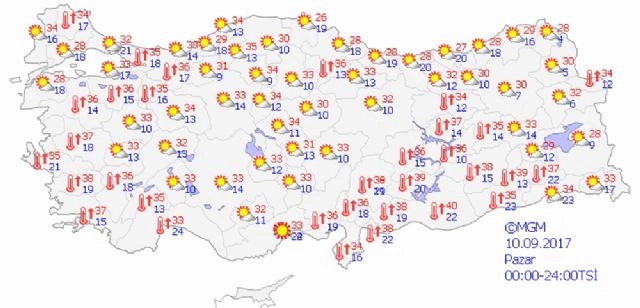 Yapılan son değerlendirmelere göre yurt genelinde yağış beklenmiyor. Bütün bölgelerin az bulutlu ve açık geçeceği tahmin ediliyor. Meteoroloji Genel Müdürlüğünden alınan tahminlere göre, ülke genelinde mevsim normallerinin üzerinde seyreden hava sıcaklığının, batı kesimlerde 2 ila 4 derecede artacağı, diğer yerlerde önemli bir değişiklik olmayacağı tahmin ediliyor. Rüzgarın ise genellikle güney ve güneybatı yönlerden hafif ara sıra orta kuvvette esmesi bekleniyor. Bazı illerde beklenen hava durumuyla günün en yüksek sıcaklıkları ise şöyle:Ankara: Az bulutlu ve açık 33İstanbul: Az bulutlu ve açık 32İzmir: Az bulutlu ve açık 35Adana: Az bulutlu ve açık 36Antalya: Az bulutlu ve açık 33Samsun: Parçalı bulutlu 28Trabzon: Parçalı ve az bulutlu 27Erzurum: Az bulutlu ve açık 30Diyarbakır: Az bulutlu ve açık 38