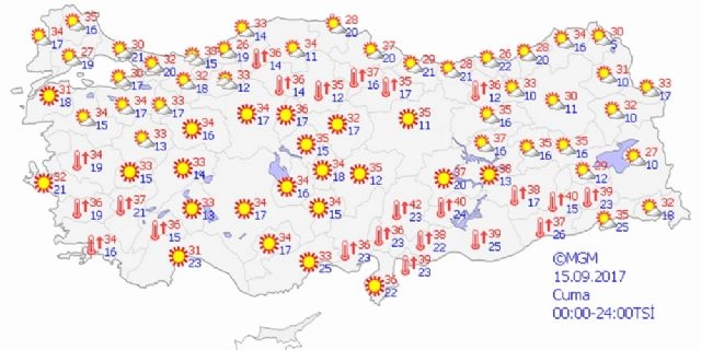 Yapılan son değerlendirmelere göre, yurt genelinin az bulutlu ve açık, öğle saatlerinden sonra Bolu ve Çankırı çevrelerinin yer yer parçalı bulutlu geçeceği tahmin ediliyor. Meteoroloji Genel Müdürlüğünden alınan tahminlere göre,hava sıcaklığının yurt genelinde mevsim normallerinin üzerinde seyretmeye devam edeceği tahmin ediliyor. Rüzgarın ise genellikle batı ve kuzeybatı, kuzeybatı kesimlerde kuzeydoğu yönlerden hafif ara sıra orta kuvvette esmesi bekleniyor.Bazı illerde beklenen hava durumuyla günün en yüksek sıcaklıkları ise şöyle:Ankara: Az bulutlu ve açık 34İstanbul: Az bulutlu ve açık 30İzmir: Az bulutlu ve açık 32Adana: Az bulutlu ve açık 36Bursa: Az bulutlu ve açık 34Antalya: Az bulutlu ve açık 31Samsun: Az bulutlu ve açık 27Trabzon: Az bulutlu ve açık 26Erzurum: Az bulutlu ve açık 30Diyarbakır: Az bulutlu ve açık 38