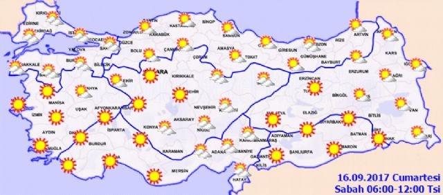 Yapılan son değerlendirmelere göre, yurdun Doğu Akdeniz, İç Anadolu'nun doğusu, Marmara'nın doğusu ile zamanla Doğu Anadolu'nun doğusu parçalı yer yer çok bulutlu, öğle saatlerinden sonra Ağrı, Kars ve Ardahan çevreleri ile Erzurum'un doğu kesimlerinin kısa süreli ve yerel olmak üzere sağanak ve gök gürültülü sağanak yağışlı, diğer yerlerin az bulutlu ve açık geçeceği tahmin ediliyor. Meteoroloji Genel Müdürlüğünden alınan tahminlere göre, hava sıcaklığın ülke genelinde mevsim normallerinin 6 ila 10 derece üzerinde seyretmeye devam edeceği tahmin ediliyor. Rüzgarın ise genellikle batı ve kuzeybatı, kuzeybatı kesimlerde kuzeydoğu yönlerden hafif ara sıra orta kuvvette esmesi bekleniyor. Bazı illerde beklenen hava durumuyla günün en yüksek sıcaklıkları ise şöyle:Ankara: Az bulutlu ve açık 36İstanbul: Az bulutlu ve açık, zamanla parçalı yer yer çok bulutlu 31İzmir: Az bulutlu ve açık 34Adana: Parçalı yer yer çok bulutlu 35Antalya: Az bulutlu ve açık 32Samsun: Az bulutlu ve açık 28Trabzon: Parçalı ve az bulutlu 27Erzurum: Az bulutlu ve açık, zamanla parçalı bulutlu, öğle saatlerinden sonra doğusu kısa süreli ve yerel olmak üzere sağanak ve gök gürültülü sağanak yağışlı 28Diyarbakır: Az bulutlu ve açık 39