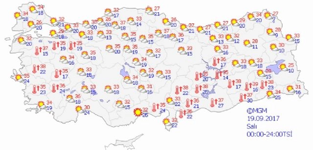 Yurdun kuzey ve iç kesimlerinin parçalı bulutlu, öğle saatlerinden sonra Isparta, Burdur, Afyonkarahisar, Konya ve Çankırı'nın batı ilçeleri, Bolu'nun güneydoğu çevreleri ile Antalya'nın yüksek kesimlerinin kısa süreli ve yerel sağanak yağışlı, diğer yerlerin az bulutlu ve açık geçeceği tahmin ediliyor.Meteoroloji Genel Müdürlüğünden alınan tahminlere göre, hava sıcaklığının ülke genelinde mevsim normallerinin 6 ila 8 derece üzerinde seyretmeye devam etmesi bekleniyor. Rüzgarın, genellikle kuzey yönlerden, güney kesimlerde güneybatı yönlerden hafif ara sıra orta kuvvette eseceği tahmin ediliyor. Bazı illerde beklenen hava durumuyla günün en yüksek sıcaklıkları ise şöyle:Ankara: Parçalı, öğle saatlerinden sonra yer yer çok bulutlu 35İstanbul: Parçalı, zamanla az bulutlu 32İzmir: Az bulutlu ve açık 35Adana: Az bulutlu ve açık 35Antalya: Az bulutlu, iç kesimleri parçalı yer yer çok bulutlu, öğle saatlerinden sonra yüksek kesimleri kısa süreli ve yerel sağanak yağışlı 30Samsun: Parçalı bulutlu, iç kesimleri yer yer çok bulutlu 26Trabzon: Parçalı bulutlu, iç kesimleri yer yer çok bulutlu 27Erzurum: Az bulutlu, öğle saatlerinden sonra parçalı bulutlu 28Diyarbakır: Az bulutlu ve açık 38