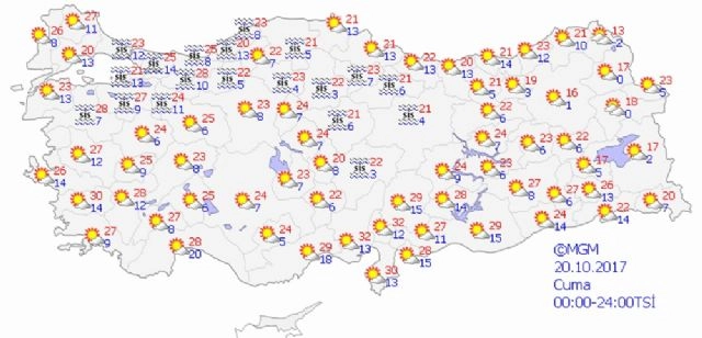 Yapılan son değerlendirmelere göre, yurtta hava durumu bugün şöyle.Yurdun genelinde yağış beklenmiyor, bütün bölgelerin az bulutlu ve açık geçeceği tahmin ediliyor. Bu sabah ve gece saatlerinde Marmara'nın doğusu, Batı Karadeniz ile Orta Karadeniz'in iç kesimlerinde yer yer pus ve sis hadisesi bekleniyor. Meteoroloji Genel Müdürlüğünden alınan tahminlere göre, hava sıcaklığında önemli bir değişiklik beklenmiyor. İç ve batı kesimlerde mevsim normallerinin 2 ila 5 derece üzerinde, doğu bölgelerde mevsim normalleri civarında seyredeceği tahmin ediliyor.Rüzgarın ise genellikle kuzey ve kuzeybatı, kuzey ve iç kesimlerde güneyli yönlerden hafif ara sıra orta kuvvette esmesi bekleniyor.Bazı illerde beklenen hava durumuyla günün en yüksek sıcaklıkları ise şöyle:Ankara: Az bulutlu ve açık 23İstanbul: Az bulutlu ve açık, bu sabah ve gece saatlerinde yer yer pus ve sisli 23İzmir: Az bulutlu ve açık 26Adana: Az bulutlu ve açık 32Bursa: Az bulutlu ve açık, bu sabah ve gece saatlerinde yer yer pus ve sisli 27Antalya: Az bulutlu ve açık 28Samsun: Az bulutlu ve açık 21Trabzon: Az bulutlu ve açık 21Erzurum: Az bulutlu 16Diyarbakır: Az bulutlu ve açık 27