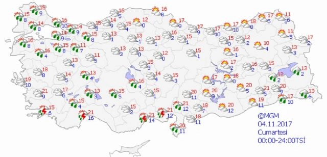 Yapılan son değerlendirmelere göre, yurtta hava durumu bugün şöyle.Ülke genelinin parçalı ve çok bulutlu, Marmara ve Akdeniz Bölgeleri, İç Anadolu'nun güney kesimleri ile Muğla, Kırıkkale, Kırşehir, Düzce, Zonguldak, Bartın, Gaziantep, Kilis ve Hakkari çevrelerinin yağışlı geçeceği tahmin ediliyor. Yağışların; gece saatlerinden itibaren Antalya çevrelerinde kuvvetli olmak üzere genellikle yağmur ve sağanak, Akdeniz kıyılarında yer yer gök gürültülü sağanak, Hakkari çevrelerinin yüksek kesimlerinde karla karışık yağmur ve kar şeklinde olması bekleniyor. Meteoroloji Genel Müdürlüğünden alınan tahminlere göre, hava sıcaklığının iç kesimlerde azalacağı ve mevsim normallerinin altında seyredeceği, diğer yerlerde önemli bir değişiklik olmayacağı ve mevsim normalleri civarında seyredeceği tahmin ediliyor. Rüzgarın genellikle güney ve batı yönlerden, kuzeybatı kesimlerde kuzey ve kuzeydoğu yönlerden hafif ara sıra orta kuvvette esmesi bekleniyor. Bazı illerde beklenen hava durumuyla günün en yüksek sıcaklıkları ise şöyle:Ankara: Parçalı ve çok bulutlu 13İstanbul: Çok bulutlu, aralıklı sağanak yağışlı 16Bursa: Çok bulutlu, aralıklı sağanak yağışlı 15İzmir: Parçalı ve çok bulutlu 19Adana: Parçalı ve çok bulutlu, öğle saatlerinden sonra kıyı kesimleri, akşam saatlerinden itibaren il geneli sağanak ve yer yer gök gürültülü sağanak yağışlı 21Antalya: Parçalı ve çok bulutlu, akşam saatlerinden itibaren sağanak ve yer yer gök gürültülü sağanak yağışlı geçecek. Yağışların gece saatlerinden sonra kuvvetli (21-50 mm) olması bekleniyor. 21Samsun: Parçalı ve çok bulutlu 17Trabzon: Parçalı ve çok bulutlu 17Erzurum: Parçalı ve çok bulutlu 10Diyarbakır: Parçalı ve çok bulutlu 20