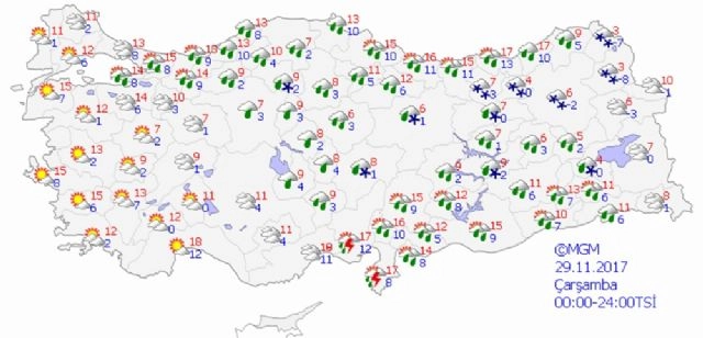 Yapılan son değerlendirmelere göre, yurtta hava durumu bugün şöyle.Yurt genelinin parçalı yer yer çok bulutlu, Doğu Akdeniz, İç Anadolu'nun doğusu, Orta ve Doğu Karadeniz, Doğu ve Güneydoğu Anadolu ile İstanbul, Kocaeli, Sakarya, Düzce, Bolu, Zonguldak, Bartın ve Kastamonu kıyılarının yağışlı geçeceği tahmin ediliyor. Genellikle yağmur ve sağanak, Doğu Karadeniz'in iç kesimleri, İç Anadolu'nun doğusu ile Doğu Anadolu ve Diyarbakır çevrelerinde karla karışık yağmur ve kar şeklinde görülecek yağışların; Osmaniye ve Hatay'ın kuzey kıyılarında kuvvetli yağmur ve sağanak (21-50 Kg/m2), Tunceli'nin kuzeyinde yoğun kar şeklinde olması bekleniyor. Meteoroloji Genel Müdürlüğünden alınan tahminlere göre, hava sıcaklığının iç kesimlerde 3 ila 6 derece azalacağı, diğer yerlerde önemli bir değişiklik olmayacağı tahmin ediliyor. Rüzgar, genellikle güney ve güneybatı, doğu kesimlerde güneydoğu, Karadeniz kıyılarında kuzey ve kuzeybatı yönlerden hafif, ara sıra orta kuvvette, İstanbul, Sinop ve İskenderun körfezinde yer yer kuvvetlice (30-50 Km/sa) eseceği tahmin ediliyor. Bazı illerde beklenen hava durumuyla günün en yüksek sıcaklıkları ise şöyle:Ankara: Parçalı ve çok bulutlu 7İstanbul: Parçalı ve çok bulutlu, sabah saatlerinde hafif yağmurlu 13İzmir: Parçalı bulutlu 15Bursa: Parçalı bulutlu 14Adana: Parçalı ve yer yer çok bulutlu, akşam saatlerine kadar aralıklı yağmurlu 17Antalya: Parçalı bulutlu 18Samsun: Parçalı ve çok bulutlu, aralıklı yağmur ve sağanak yağışlı 15Trabzon: Parçalı yer yer çok bulutlu, aralıklı yağmur ve sağanak yağışlı 17Erzurum: Parçalı yer yer çok bulutlu, aralıklı karla karışık yağmur ve kar yağışlı -2Diyarbakır: Parçalı ve çok bulutlu, aralıklı yağmur, gece saatlerinde karla karışık yağmurlu 12