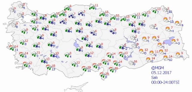 Marmara'nın doğusu, İç Ege, Akdeniz, İç Anadolu, Karadeniz, Doğu ve Güneydoğu Anadolu'nun batısı ile Erzurum, Kars, Ardahan, Muş, Diyarbakır, Batman ve Mardin çevrelerinin yağışlı geçeceği tahmin ediliyor. Genellikle yağmur ve sağanak şeklinde görülecek olan yağışların, Marmara'nın güneydoğusu, İç Anadolu, Karadeniz'in iç kesimleri, Doğu Anadolu'nun kuzeyi ile Afyonkarahisar, Kütahya, Uşak, Isparta ve Malatya çevrelerinde karla karışık yağmur ve kar şeklinde olması bekleniyor. Yağışların; Batı ve Orta Karadeniz kıyılarında kuvvetli yağmur ve sağanak, Batı Karadeniz'in iç kesimleri ile Ordu ve Giresun'un iç ve yüksek kesimlerinde yoğun kar yağışı şeklinde olacağı tahmin ediliyor. Gece ve sabah saatlerinde iç ve doğu kesimlerde yer yer sis ve pus hadisesi görüleceği tahmin ediliyor.Meteoroloji Genel Müdürlüğünden alınan tahminlere göre, hava sıcaklığının kuzey, iç ve batı bölgelerde hissedilir derecede (6-10 derece) azalacağı tahmin ediliyor. Rüzgarın, genellikle kuzey ve kuzeybatı, doğu bölgelerde güney ve güneybatı yönlerden hafif, ara sıra orta kuvvette, Marmara'nın kuzeyi, Güney Ege kıyıları, Antalya Körfezi, Doğu Akdeniz kıyıları ile Çeşme çevrelerinde yer yer kuvvetli (30-60 km/sa) olarak esmesi bekleniyor.Bazı illerde beklenen hava durumuyla günün en yüksek sıcaklıkları ise şöyle:Ankara: Parçalı çok bulutlu, sabah saatlerinde yağmurlu, zamanla karla karışık yağmur ve yüksekleri kar yağışlı 6İstanbul: Parçalı ve çok bulutlu, aralıklı yağmur ve sağanak yağışlı 7İzmir: Parçalı ve çok bulutlu 14Bursa: Parçalı çok bulutlu ve yağmurlu, gece saatlerinde karla karışık yağmurlu 7Adana: Parçalı, zamanla çok bulutlu, akşam saatlerinden itibaren sağanak yağışlı 19Antalya: Parçalı ve çok bulutlu, sabah saatlerinde sağanak yağışlı 18Samsun: Parçalı çok bulutlu, öğle saatlerinden itibaren kuvvetli olmak üzere aralıklı yağmur ve sağanak yağışlı 13Trabzon: Parçalı, zamanla çok bulutlu, akşam saatlerinden itibaren sağanak yağışlı 13Erzurum: Parçalı ve az bulutlu, zamanla çok bulutlu, gece saatlerinde kar yağışlı 5Diyarbakır: Az bulutlu, zamanla parçalı ve çok bulutlu, akşam saatlerinden sonra sağanak yağışlı 12