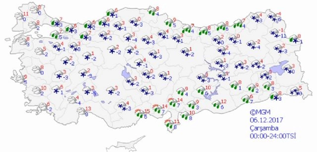 Yapılan son değerlendirmelere göre, yurtta hava durumu bugün şöyle. Marmara'nın doğusu, İç Anadolu, Karadeniz, Doğu ve Güneydoğu Anadolu ile Kütahya, Afyonkarahisar ve Denizli çevrelerinin yağışlı geçeceği tahmin ediliyor. Yağışların Orta ve Doğu Karadeniz kıyıları ile Güneydoğu Anadolu'da yağmur ve sağanak, yağış alan diğer yerlerde karla karışık yağmur ve kar şeklinde olması bekleniyor. Yağışların; Orta ve Doğu Karadeniz kıyılarında kuvvetli yağmur ve sağanak, Bolu, Muş, Bitlis, Şırnak, Van'ın güneyi, Hakkari, Bingöl, Diyarbakır ve Batman'ın kuzey kesimleri ve Doğu Karadeniz'in iç kesimlerinde yoğun kar yağışı şeklinde olacağı tahmin ediliyor. Meteoroloji Genel Müdürlüğü'nden alınan tahminlere göre, hava sıcaklığı güney, iç ve doğu bölgelerde hissedilir derecede (6-10 derece) azalacak. Rüzgarın, genellikle kuzey ve kuzeybatı, Doğu Akdeniz kıyıları ile güneydoğu bölgelerde güneyli yönlerden hafif, ara sıra orta kuvvette, Güney Ege, Akdeniz ile Doğu Anadolu'nun güneybatı kesimlerinde yer yer kuvvetli (40-70 km/sa) olarak esmesi bekleniyor.Bazı illerde beklenen hava durumuyla günün en yüksek sıcaklıkları ise şöyle:Ankara: Parçalı çok bulutlu, hafif kar yağışlı 2İstanbul: Parçalı ve çok bulutlu, aralıklı yağmur ve karla karışık yağmurlu, yüksekleri kar yağışlı 7İzmir: Parçalı ve çok bulutlu 9Bursa: Parçalı ve çok bulutlu, aralıklı yağmur ve karla karışık yağmurlu, zamanla kar yağışlı 4Adana: Parçalı ve çok bulutlu 14Antalya: Parçalı ve çok bulutlu 13Samsun: Parçalı çok bulutlu ve yağmurlu 9Trabzon: Parçalı, zamanla çok bulutlu, kuvvetli olmak üzere yağmurlu, yüksekleri yer yer yoğun kar yağışlı 8Erzurum: Parçalı ve çok bulutlu, aralıklı kar yağışlı -2Diyarbakır: Parçalı ve çok bulutlu, aralıklı yağmurlu 8