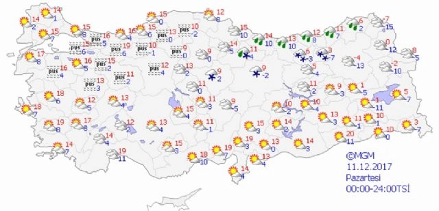 Yurdun kuzey ve batı kesimlerinin parçalı yer yer çok bulutlu, Doğu Karadeniz, Samsun, Tokat, Ordu, Sivas ve Erzincan çevrelerinin yağışlı, diğer yerlerin parçalı ve az bulutlu geçeceği tahmin ediliyor Yağışların; kıyı kesimler ile Tokat çevrelerinde yağmur ve sağanak, iç kesimlerde karla karışık yağmur ve kar şeklinde olması bekleniyor. Bu sabah ve gece saatlerinde Marmara'nın doğusu, İç Ege, İç Anadolu'nun kuzeydoğusu ile Batı Karadeniz'in iç kesimlerinde yer yer sis ve pus hadisesi bekleniyor. Meteoroloji Genel Müdürlüğü'nden alınan tahminlere göre hava sıcaklığıdoğu kesimlerde 2 ila 4 derece artacak ve ülke genelinde mevsim normalleri civarında seyredecek. Rüzgarın genellikle güney ve güneybatı yönlerden hafif, ara sıra orta kuvvette, Doğu Karadeniz'de zaman zaman kuvvetlice (30-50 km/saat) eseceği tahmin ediliyor. Bazı illerde beklenen hava durumuyla günün en yüksek sıcaklıkları ise şöyle:Ankara: Parçalı ve az bulutlu 12İstanbul: Parçalı ve az bulutlu 15İzmir: Az bulutlu, zamanla parçalı ve çok bulutlu 18Bursa: Parçalı ve az bulutlu 17Adana: Parçalı ve az bulutlu 19Antalya: Parçalı ve az bulutlu 19Samsun: Parçalı yer yer çok bulutlu, sabah saatlerinde hafif yağmurlu 15Trabzon: Parçalı yer yer çok bulutlu, sabah saatlerinde yağmurlu 12Erzurum: Parçalı, kuzeyi çok bulutlu -4Diyarbakır: Parçalı ve az bulutlu 13