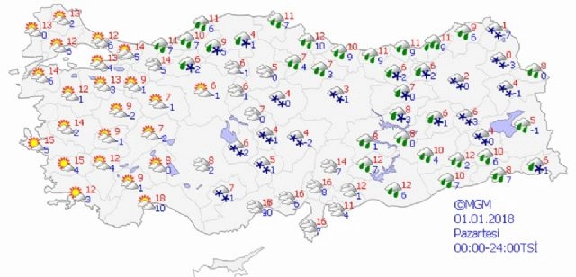 Yapılan son değerlendirmelere göre, yurtta bugün hava durumu şöyle.İç Anadolu'nun doğusu, Orta ve Doğu Karadeniz, Doğu Anadolu, Güneydoğu Anadolu'nun kuzey ve doğusu ile Kahramanmaraş, Karaman, Sinop ve Şanlıurfa çevrelerinin yağışlı geçeceği tahmin ediliyor. Yağışların; Rize çevreleri ile Artvin'in kıyı kesimlerinde kuvvetli olmak üzere, kıyı kesimler ve Güneydoğu Anadolu ile Kahramanmaraş, Amasya, Iğdır ve Şırnak çevrelerinde yağmur ve sağanak, yağış alan diğer yerlerde karla karışık yağmur ve kar şeklinde olması bekleniyor. Sabah ve gece saatlerinde iç ve doğu kesimlerde yer yer buzlanma ve don olayı bekleniyor. Meteoroloji Genel Müdürlüğü'nden alınan tahminlere göre, hava sıcaklığıyağışla birlikte kuzey, iç ve doğu kesimlerde azalacak, diğer yerlerde önemli bir değişiklik olmayacak ve ülke genelinde mevsim normallerinin üzerinde seyredecek. Rüzgarın, genellikle batı ve kuzeybatı, güneydoğu kesimler ile zamanla kuzeybatı bölgelerde güney ve güneybatı yönlerden hafif ara sıra orta kuvvette, sabah saatlerinde Güney Ege kıyılarında yer yer kuvvetlice (30-50 km/sa) esmesi bekleniyor.Bazı illerde beklenen hava durumuyla günün en yüksek sıcaklıkları ise şöyle:Ankara: Parçalı zamanla az bulutlu 6İstanbul: Parçalı ve az bulutlu 12İzmir: Az bulutlu ve açık 15Bursa: Parçalı ve az bulutlu 14Adana: Parçalı ve çok bulutlu 16Antalya: Parçalı ve az bulutlu 18Samsun: Çok bulutlu, aralıklı yağmur ve sağanak yağışlı 12Trabzon: Çok bulutlu, aralıklı yağmur ve sağanak yağışlı 11Erzurum: Çok bulutlu ve aralıklı kar yağışlı 2Diyarbakır: Parçalı çok bulutlu, aralıklı yağmur ve sağanak yağışlı 10