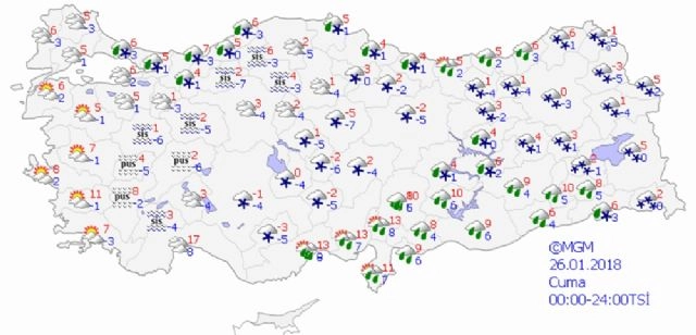 Yapılan son değerlendirmelere göre, yurtta hava durumu bugün şöyle. Yurt genelinin çok bulutlu, Doğu Akdeniz, Doğu Karadeniz, Doğu ve Güneydoğu Anadolu ile İstanbul, Sakarya, Kocaeli, Konya, Karaman, Sivas, Sinop, Samsun, Ordu, Tokat çevreleri ile Kastamonu'nun kıyı kesimlerinin yağışlı geçeceği tahmin ediliyor. Yağışların; Hakkari çevreleri ve Van'ın güneyinde yoğun kar şeklinde olmak üzere genellikle karla karışık yağmur ve kar, Akdeniz ile Doğu Karadeniz kıyıları ve Güneydoğu Anadolu bölgesinde yağmur ve sağanak şeklinde olması bekleniyor. Bu sabah ve gece saatlerinde iç ve doğu kesimlerde buzlanma ve don olayı ile birlikte yer yer sis ve pus olayı görüleceği tahmin ediliyor. Meteoroloji Genel Müdürlüğünden alınan tahminlere göre, hava sıcaklığının yurt genelinde mevsim normallerinin altında seyredeceği tahmin ediliyor.Rüzgarın ise genellikle kuzey ve kuzeydoğu yönlerden hafif, ara sıra orta kuvvette, Marmara ve Kıyı Ege ile batı Akdeniz'in iç kesimlerinde kuvvetli (40-60 km/sa)olarak eseceği tahmin ediliyor.Bazı illerde beklenen hava durumuyla günün en yüksek sıcaklıkları ise şöyle:Ankara: Parçalı ve çok bulutlu 3İstanbul: Çok bulutlu, yerel olmak üzere hafif karla karışık yağmur ve yüksekleri hafif kar yağışlı 6İzmir: Parçalı bulutlu 8Adana: Çok bulutlu ve aralıklı yağışlı geçeceği tahmin ediliyor. Yağışların yağmur ve sağanak yüksek kesimlerinde kar yağışı şeklinde olması bekleniyor. 13Antalya: Çok bulutlu 17Samsun: Çok bulutlu, aralıklı karlakarışık yağmur ve yüksekleri kar yağışlı 4Trabzon: Çok bulutlu, aralıklı yağmurlu, iç kesimleri kar yağışlı 5Erzurum: Çok bulutlu, aralıklı kar yağışlı 0Diyarbakır: Çok bulutlu ve aralıklı yağmurlu 9