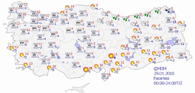 Yapılan son değerlendirmelere göre, yurtta bugün hava durumu şöyle.Meteoroloji Genel Müdürlüğünden alınan tahminlere göre, yurdun kuzey ve iç kesimlerinin parçalı ve çok bulutlu, Doğu Karadeniz kıyıları ile Ordu çevrelerinin yağmur ve sağanak yağışlı, Trabzon ve Rize'nin iç ve yüksek kesimleri ile Artvin ve Ardahan çevrelerinin karla karışık yağmur ve kar yağışlı, diğer yerlerin az bulutlu ve açık geçeceği tahmin ediliyor. Bu sabah ve gece saatlerinde iç ve doğu kesimlerde buzlanma ve don olayı ile birlikte yer yer pus ve sis hadisesi bekleniyor. Hava sıcaklığı iç ve batı kesimlerde 1 ila 3 derece artacak, diğer yerlerde 1 ila 3 derece azalacak, ülke genelinde mevsim normallerinin altında seyredecek. Rüzgarın, genellikle güneyli, Akdeniz kıyıları ile Güneydoğu Anadolu'da kuzeyli yönlerden hafif, ara sıra orta kuvvette eseceği tahmin ediliyor. Bazı illerde beklenen hava durumuyla günün en yüksek sıcaklıkları ise şöyle: Ankara: Çok bulutlu, zamanla parçalı bulutlu 4 İstanbul: Parçalı bulutlu, bu sabah ve gece saatlerinde yer yer puslu 10 İzmir: Az bulutlu ve açık 13 Adana: Az bulutlu ve açık 16 Antalya: Az bulutlu ve açık 20 Samsun: Parçalı ve çok bulutlu 10 Trabzon: Çok bulutlu, aralıklı yağmurlu, iç kesimlerinin yüksekleri hafif kar yağışlı 10 Erzurum: Parçalı ve çok bulutlu -3 Diyarbakır: Az bulutlu ve açık 11