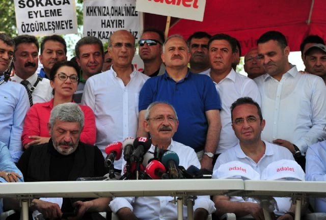 CHP Genel Başkanı Kemal Kılıçdaroğlu, "Adalet yürüyüşümüzün birinci etabını tamamladık. Yorgun değiliz, kararlıyız. Endişeli değiliz. Umarım hedefe ulaşırız. Zaman zaman yolda provokatif eylemler de oldu ama tahriklere kapılmadık, kapılmayacağız" dedi.CHP Milletvekili Enis Berberoğlu'nun tutuklanmasının ardından bugün Ankara Güvenpark'tan İstanbul'a başlatılan yürüyüşün ilk günü sona erdi. Kılıçdaroğlu ve beraberindekilerin ilk günkü yürüyüşü Batıkent Hipodromu'nda sonlandı. Kılıçdaroğlu ve partililer Güvenpark'tan Hipodrom'a kadar olan yaklaşık 20 kilometrelik yolu 5 saatte yürüdü. Hipodrom'da yaptığı açıklamada Kılıçdaroğlu, "Adalet yürüyüşümüzün birinci etabını tamamladık. Yorgun değiliz, kararlıyız. Endişeli değiliz. Umarım hedefe ulaşırız. Zaman zaman yolda provokatif eylemler de oldu ama tahriklere kapılmadık, kapılmayacağız. Biz haklıyız adalet için yürüyoruz, yürümeye devam edeceğiz. Gün gelecek bugün adaletsizliği yaratanlar için de adalet geçerli bir kavram olacak. Onlara da adalet lazım olacak. Biz onlar adaletsiz yargılandıkları zaman yine yollarda olacağız. Adalet bu ülkede yaşayan 80 milyon vatandaşın hak ettiği bir olgudur. Dolayısıyla kararlılıkla, azimle yolumuza devam edeceğiz" diye konuştu."TÜRKİYE'DE DEMOKRASİ YOK"Kılıçdaroğlu, gün boyu kendisini takip eden basın mensuplarına yönelik ise şunları söyledi:"Sizler de bizi izlediniz, umarım yorulmamışsınızdır. Belki sizin de gazetecilik hayatınıza renkli bir sayfa olarak bu yürüyüşümüz geçer. Adalet bizim için geçerli, sizin için de geçerli. Özellikle sizin arkadaşlarınız hapiste. Bir ara uçakta seyahat ederken Meclis Başkanına şunu söylemiştim, '150'nin üstünde gazetecinin hapiste olduğu bir ülkede siz demokrasiyi dünyaya anlatamazsınız.' Gerçekten de demokrasiyi dünyaya anlatamazlar. Çünkü dünyada bilinen bir gerçek Türkiye'de demokrasi yok. Bu yürüyüşümüzü ayrıca uluslararası yayın organlarının da çok geniş bir şekilde verdiklerini söylediler. Bizim televizyonlarımız da geniş şekilde vermiş. Bütün gazeteci arkadaşlarıma verdikleri destek için yürekten teşekkür ediyorum.""DİĞER İLLERDE, İLÇELERDE ADALET YÜRÜYÜŞLERİ OLURSA MUTLULUK DUYARIZ ""Bu yürüyüşümüz bir şenlik aslında" diyen Kılıçdaroğlu, "Adalet arıyoruz. Endişeli değiliz. Yolda gelirken gençlerimiz slogan attılar, alkışladılar. Bir şenlik, bahar havası içinde yürüyüşümüzü yaptık. Diğer illerde de elbette olacaktır. Olması da gerekiyor. Adalet kim için geçerli? Bizim için hepimiz için geçerli bir kavram. Dolayısıyla diğer illerde, ilçelerde adalet yürüyüşleri olursa mutluluk duyarız tabi. Akşam burada konaklayacağız. Elbette arkadaşlar bir araya geldiler. Konuşacaklar, fıkra anlatacaklar, öyküler anlatacaklar, başlarından geçen hikayeleri anlatacaklar. Şenlikli bir akşam olacak. Ben de arkadaşlarımla beraber olacağım" ifadelerini kullandı.