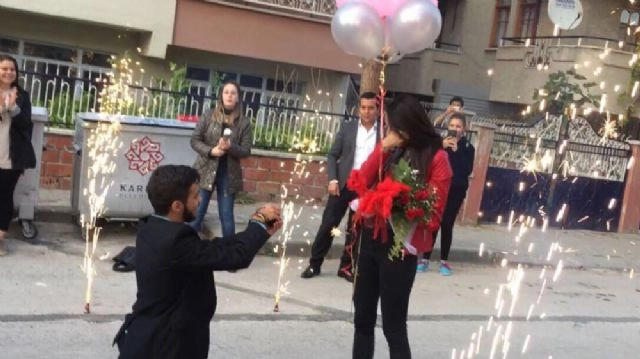 Balıkesir'de İlkan Çivicioğlu isimli genç, ekip arkadaşlarıyla birlikte sergilediği zeybek oyunu sonrası gelin adayının önünde diz çökerek evlenme teklifinde bulundu.Balıkesir'de Ferman Halk Oyunları grubunda eğitmen olan İlkan Çivicioğlu, sevdiği kıza evlenme teklifi yapmak için evinin kapısına güller serdi. Çivicioğlu, halk oyunları ekibi ile birlikte sokak ortasında sergilediği zeybek oyunu eşliğinde Belinay Değirmenci'ye evlenme teklifinde bulundu. Konfetilerin patlatılması ve zeybek oyununun ardından damat adayı dizlerinin üzerine çökerek yüzük uzattığı Belinay Değirmenci'ye evlilik teklifinde bulundu. Şaşkınlığını gizleyemeyen Değirmenci evlilik teklifine 'evet' diyerek İlkan Çivicioğlu'na sarıldı. O mutlu anlar ise vatandaşlar tarafından cep telefonuyla çekilen görüntülere yansıdı.