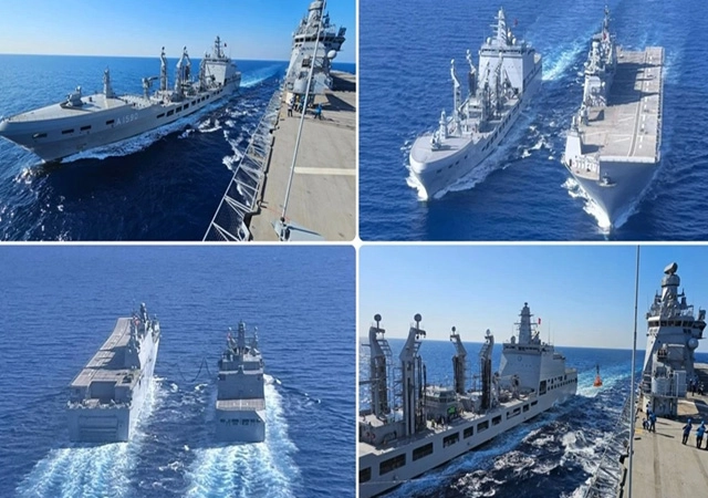 Milli Savunma Bakanlığı, TCG Anadolu çok maksatlı amfibi gemisi ile TCG Derya denizde ikmal muharebe destek gemisinin, ilk defa 'denizde akaryakıt ve katı yük ikmali' gerçekleştirdiğini bildirdi.