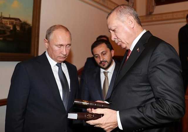 Cumhurbaşkanı Erdoğan, Rusya Devlet Başkanı Putin'e yazar Alev Alatlı'nın "Dünya Nöbeti - Gogol'un İzinde 2. Kitap" adlı eserinin Rusça'sını hediye olarak takdim etti.