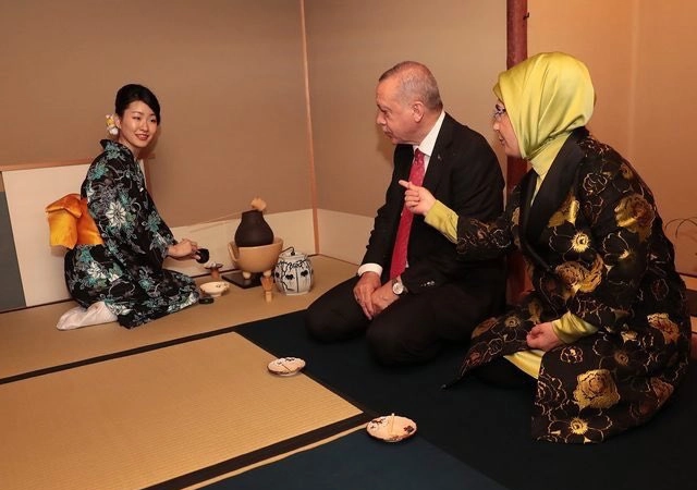 Erdoğan ve Emine Erdoğan, konuşmanın ardından daha sonra ikram edilen çayı seremoni eşliğinde içtiler.