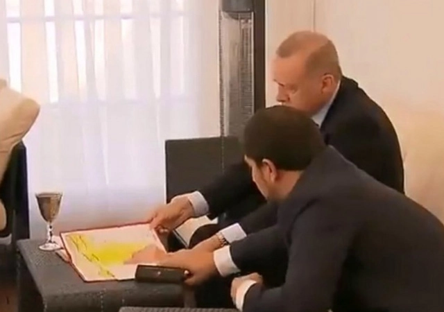 Görüşmenin basına kapalı bölümünde Cumhurbaşkanı Erdoğan, kırmızı dosyada yanında yer alan, Suriye'de kurulacak güvenli bölge haritasını masaya koydu.