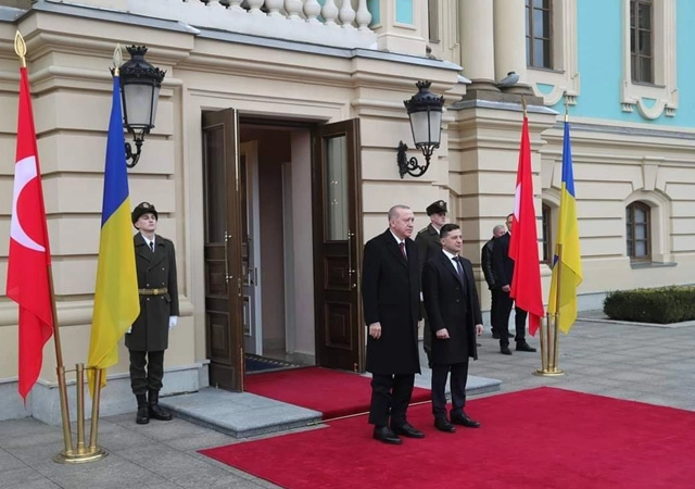 Erdoğan, Saray'a geldiğinde Ukrayna Devlet Başkanı Zelenskiy tarafından karşılandı. Erdoğan ve Zelenskiy, tören alanında yerlerini aldılar. Türkiye ve Ukrayna milli marşları çalındı. Ardından Erdoğan, tören kıtasını 'Slava Ukraine (Yaşasın Ukrayna)' ifadesini kullanarak selamladı.