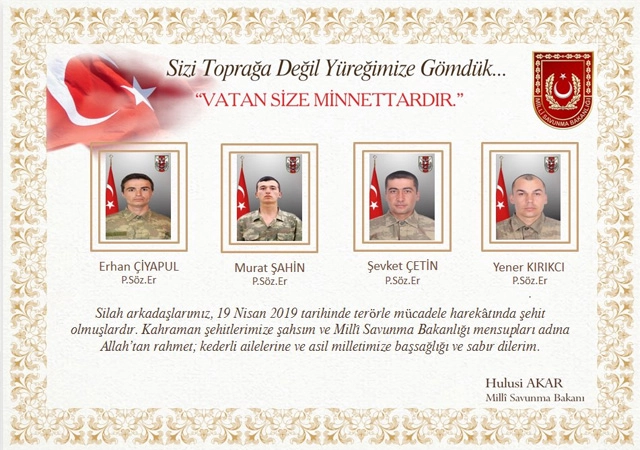 Söz konusu olan bu açıklamada,"19 Nisan 2019 tarihinde terör ile mücadele operasyonunda arkadaşlarımız şehit oldular. Milli Savunma Bakanlığı adına Allah'tan rahmet dilemekteyiz." ifadesinde bulunuldu.