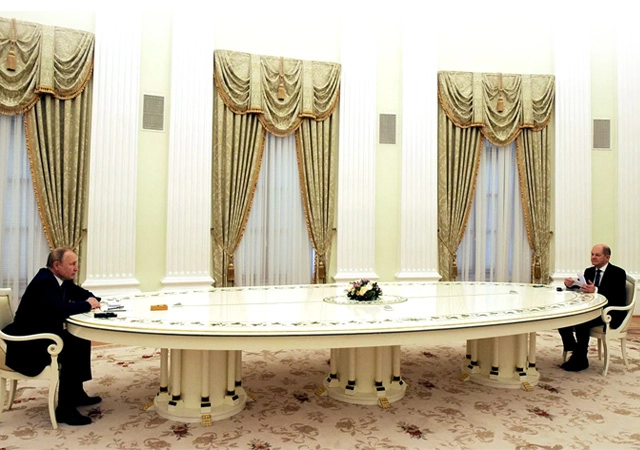 Alman Başbakan'ın, masanın karşı ucunda oturduğu görülürken, Rus liderin Macron'a yaptığı gibi Scholz ile arasına koyduğu "mesafe" dikkatlerden kaçmadı.