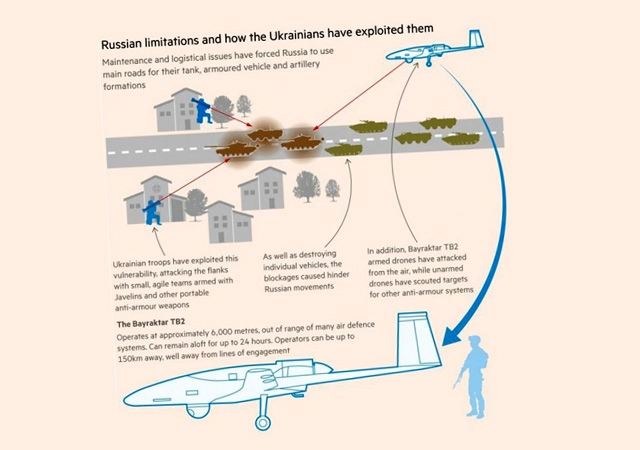 SİHA'ların özelliklerini paylaşan Financial Times gazetesi, "Moskova'nın yıldırım hızıyla ilerleyememesi, kompakt ekipman kullanımına çok şey borçlu." dedi.