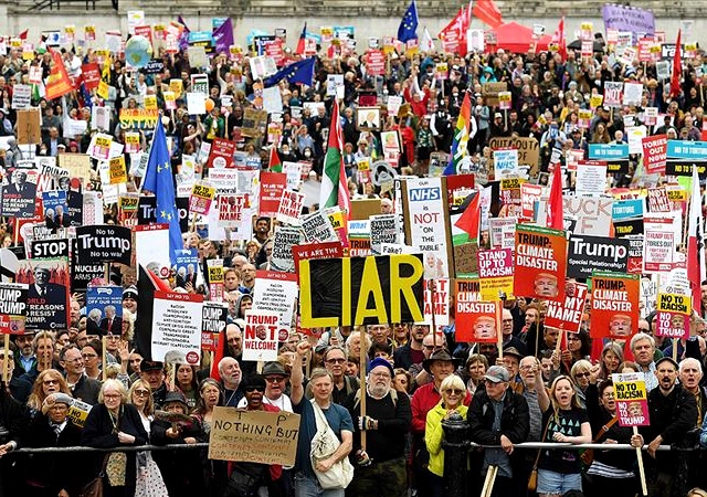Dün Kraliçe Elizabeth ile bir akşam yemeğinde bir araya gelen ABD Başkanı Trump'ın ziyareti, tüm ülke genelinde protesto edildi.