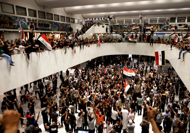 Irak'ın başkenti Bağdat'ta hükümet binalarının bulunduğu Yeşil Bölge önünde toplanan Sadr Hareketi mensubu yüzlerce kişi, beton bariyerleri aşarak Meclis binasına girdi.