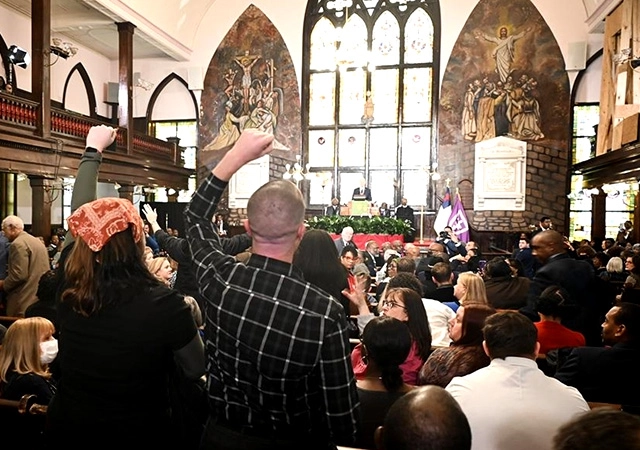 Kilisede ayağa kalkarak Gazze'ye atfen, "Şimdi ateşkes" şeklinde slogan atan göstericiler, Biden'a 'ateşkes için adım atması' çağrısında bulundu.