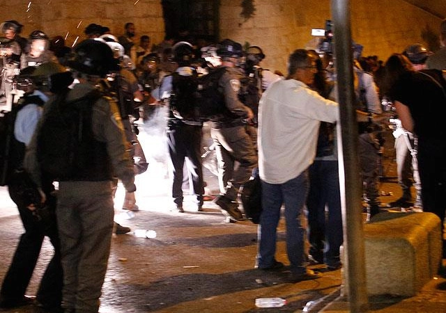 İsrail güçleri, Mescid-i Aksa'nın kapılarına kurulan elektronik metal arama dedektörü uygulamasını protesto etmek, akşam ve yatsı namazlarını kapıda kılmak isteyen Filistinlilere, plastik mermi, ses bombası ve göz yaşartıcı gazla müdahale etti.
