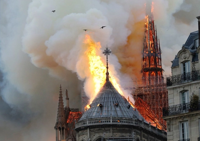 Katedralin kulesi çötü Yangın nedeniyle kadetralin kulesi yıkıldı ve çatısı çöktü. Fransa Cumhurbaşkanı Macron, Sarı Yelekler eylemlerinde protestocuların beklentilerine dair ilk somut önlemleri alacağı basın toplantısını yangından dolayı erteleme kararı aldı. Olay yerine gelerek, incelemede bulundu.