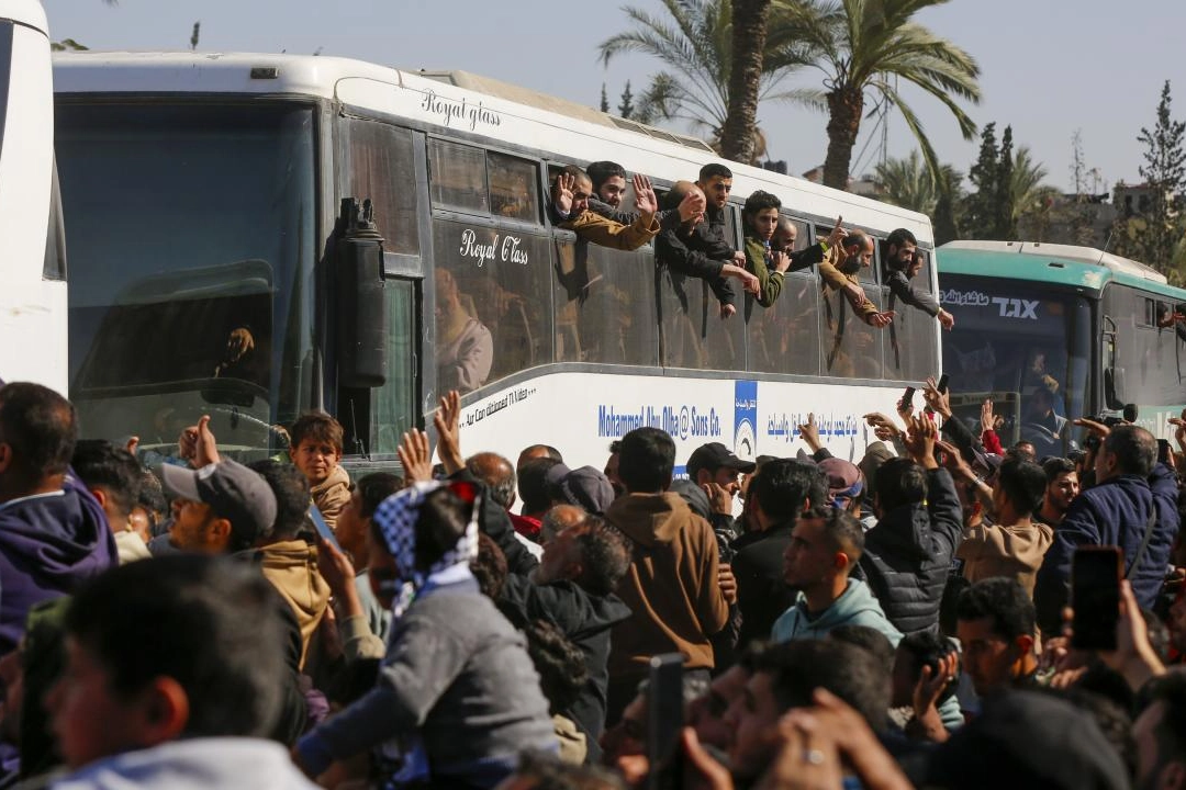 İsrail'in Ofer Askeri Cezaevi'nden serbest bırakılan Filistinli esirleri taşıyan otobüs, Uluslararası Kızılhaç ekiplerinin eşliğinde Ramallah kentindeki Kültür Sarayı'na ulaştı.